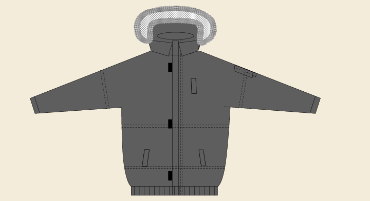 Воротник - втачная стойка. Съёмный капюшон отделан искусственным мехом "под волка" на молнии, чтобы снять мех в сырую погоду.